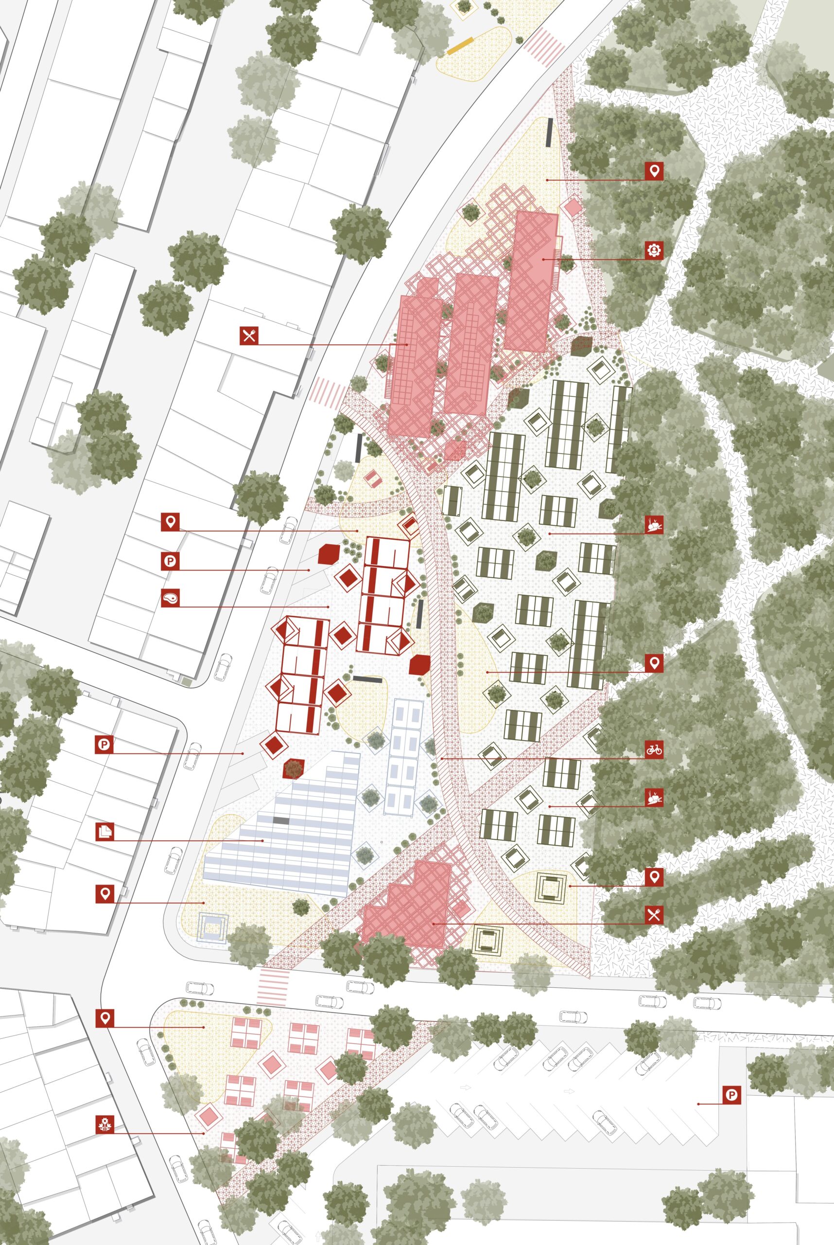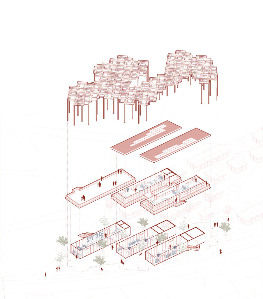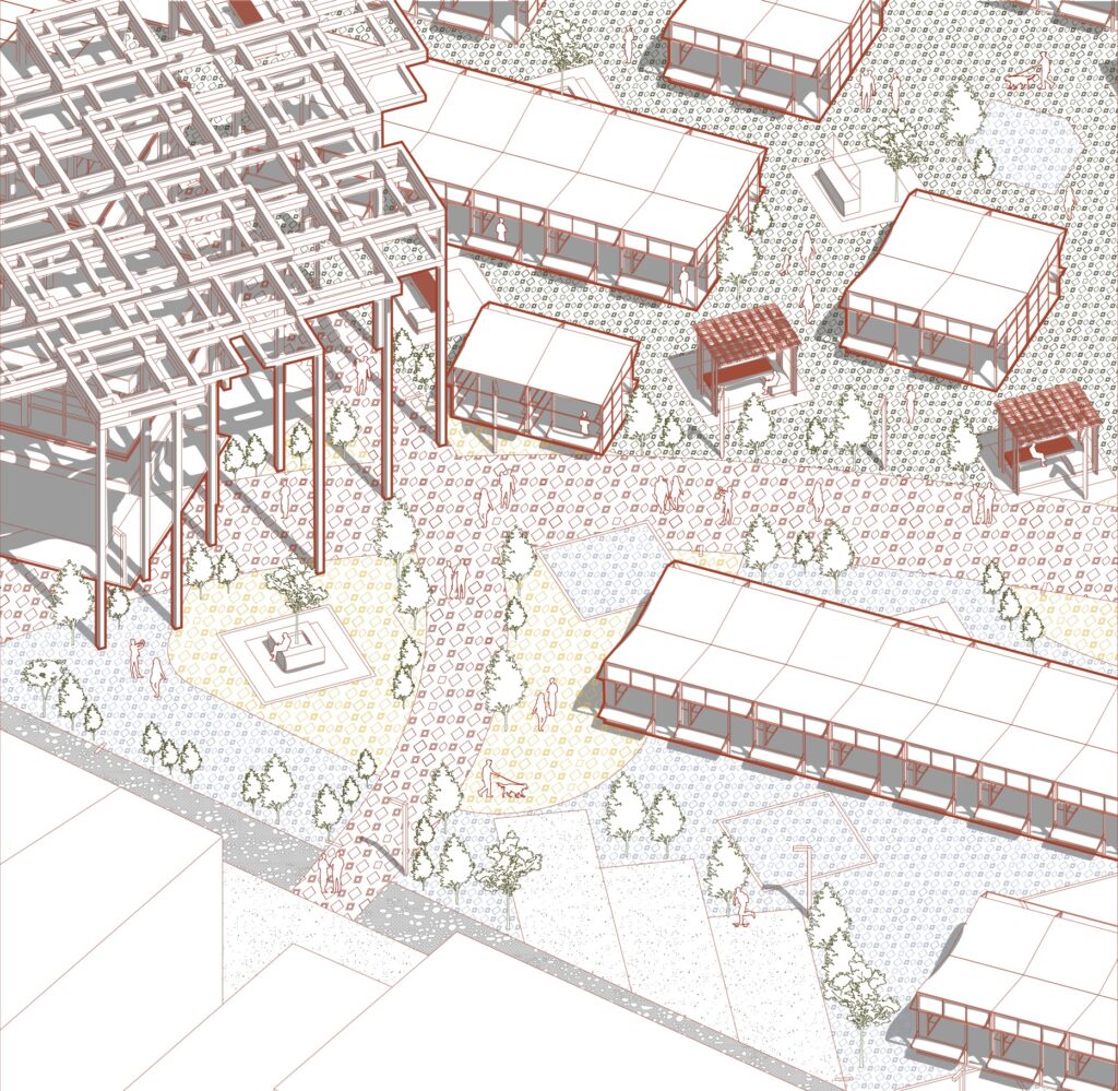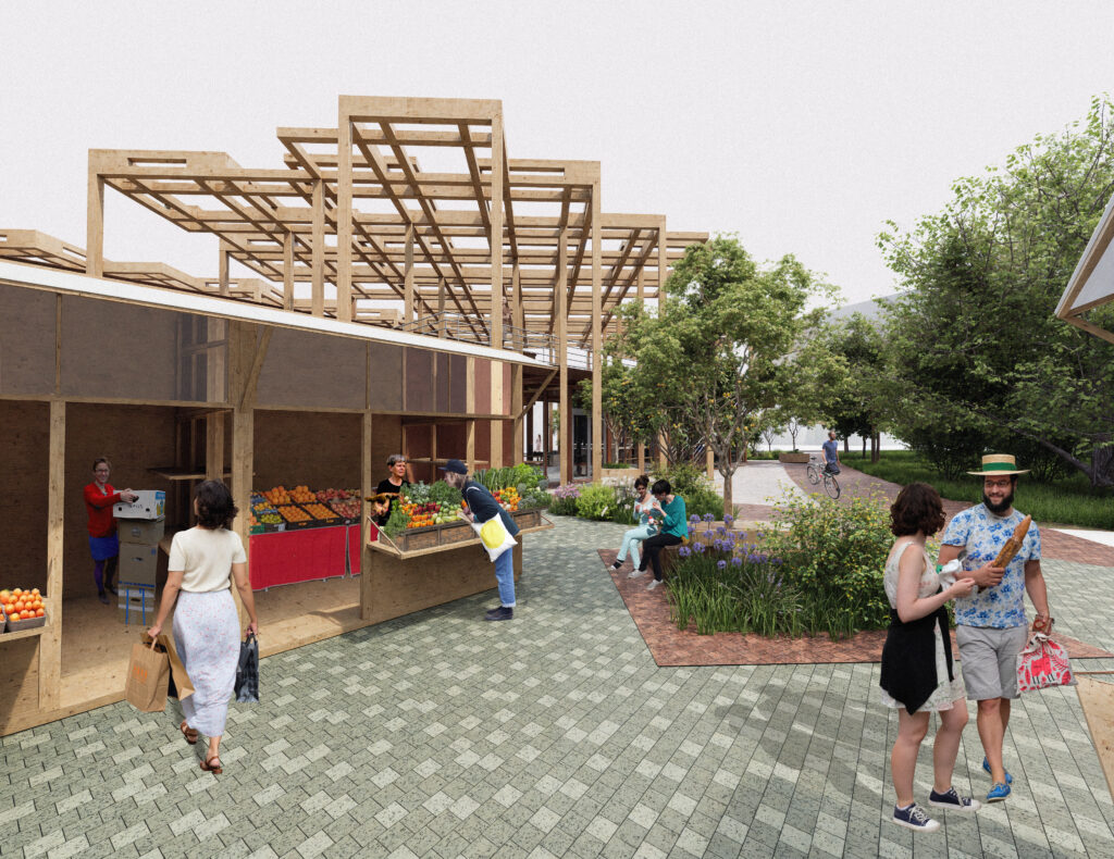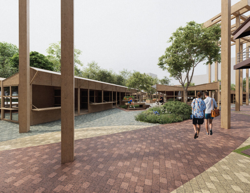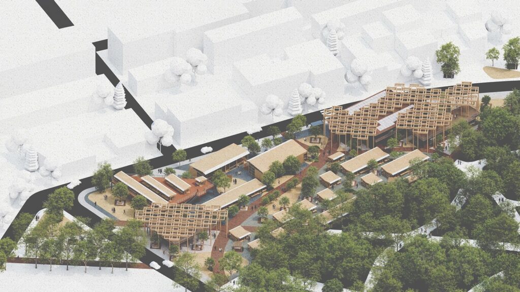 The masterplan organizes the market around three blocks, three separate market building volumes, linked by a timber canopy, with a central ribbon that extends the park into the city. This ribbon structures movement, defines public spaces, and brings together commerce, leisure, and social interaction, creating a cohesive urban fabric within the site.