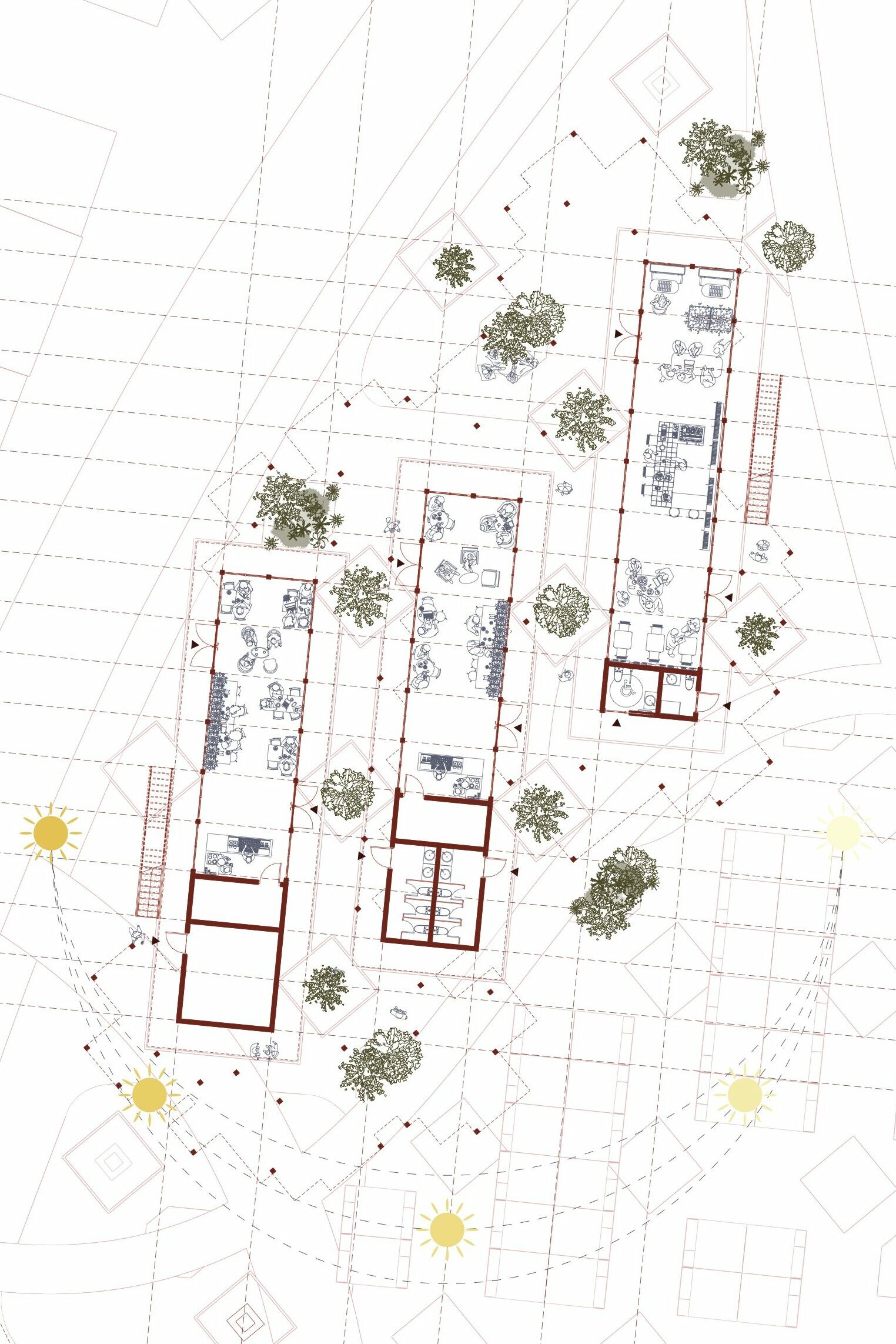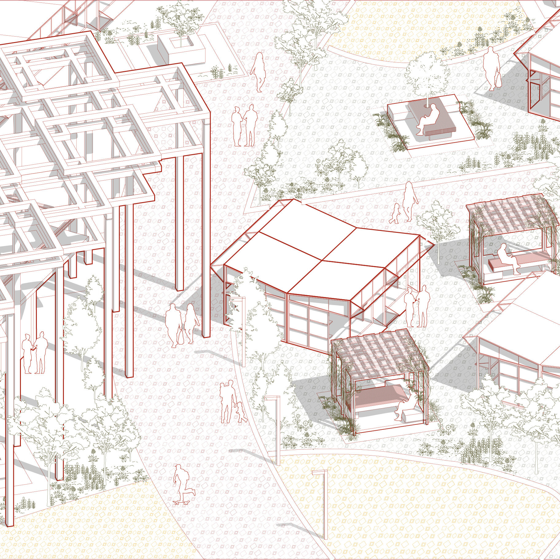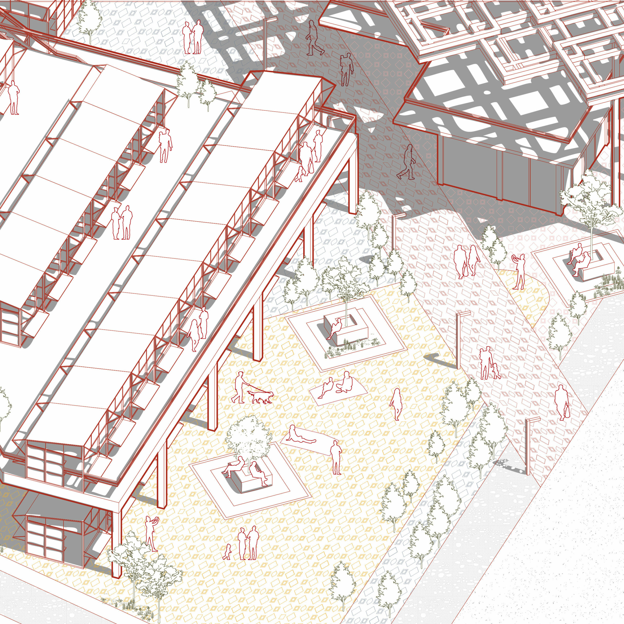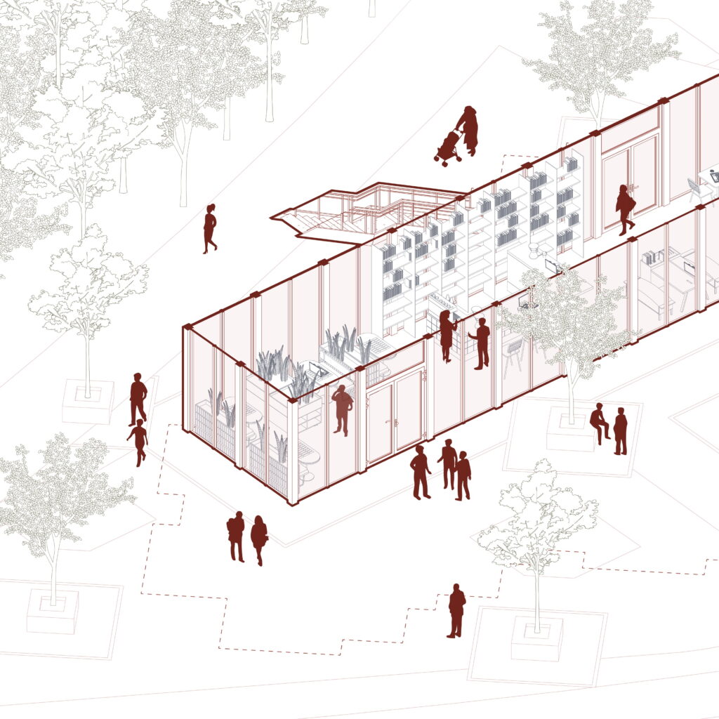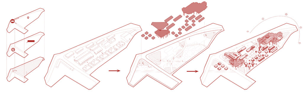 The masterplan organizes the market around three blocks, three separate market building volumes, linked by a timber canopy, with a central ribbon that extends the park into the city. This ribbon structures movement, defines public spaces, and brings together commerce, leisure, and social interaction, creating a cohesive urban fabric within the site.