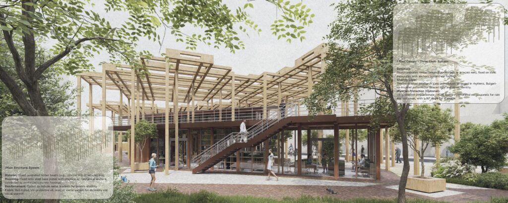 The canopy draws on Bulgarian ornamental traditions, using layered timber slats for shade, ventilation, and depth. Wood is chosen for its warmth, tactility, and sustainability, with a red-tinted finish recalling local clay and rooftops. By responding to sun and wind, the architecture aligns with ecology while celebrating heritage, creating a living, inclusive civic space.