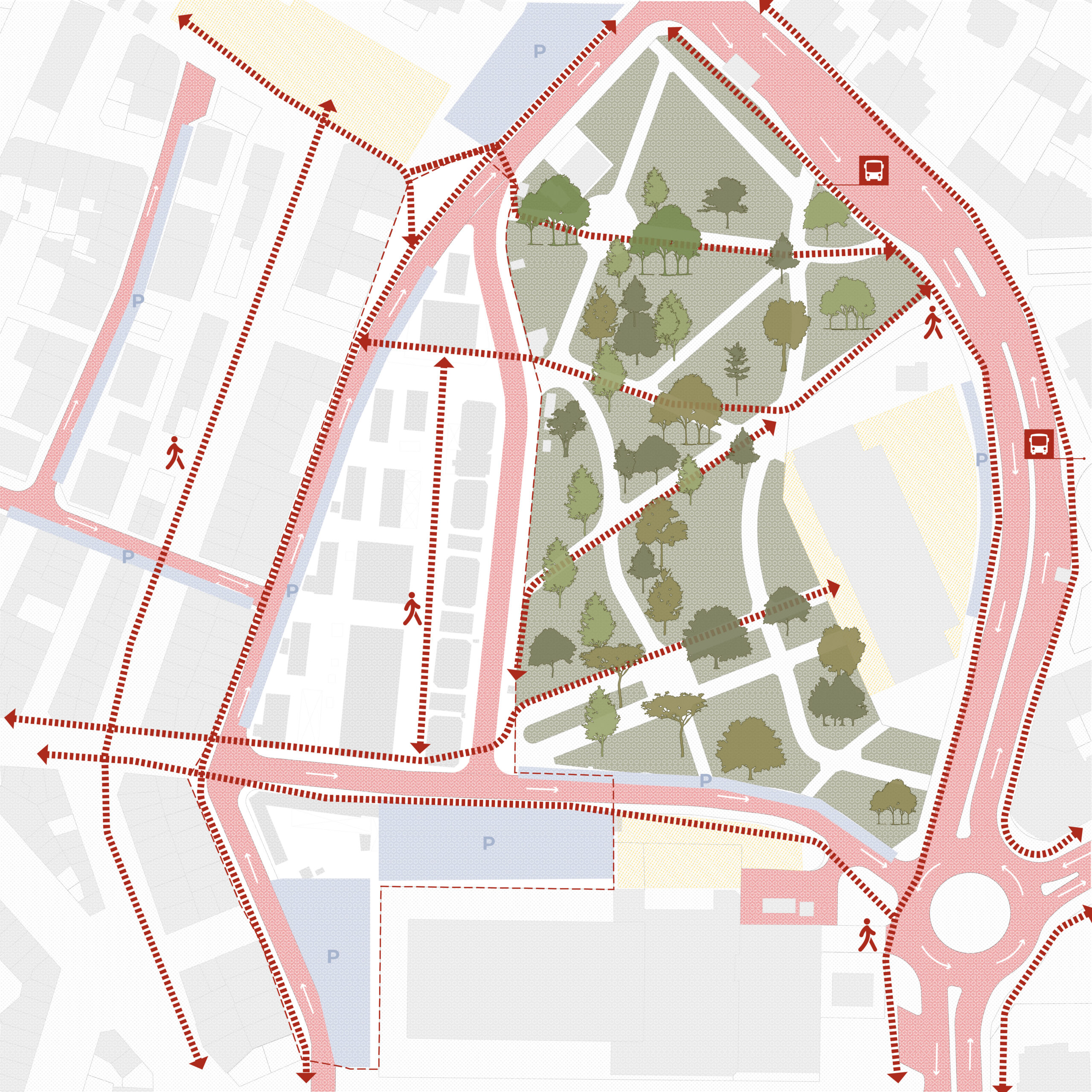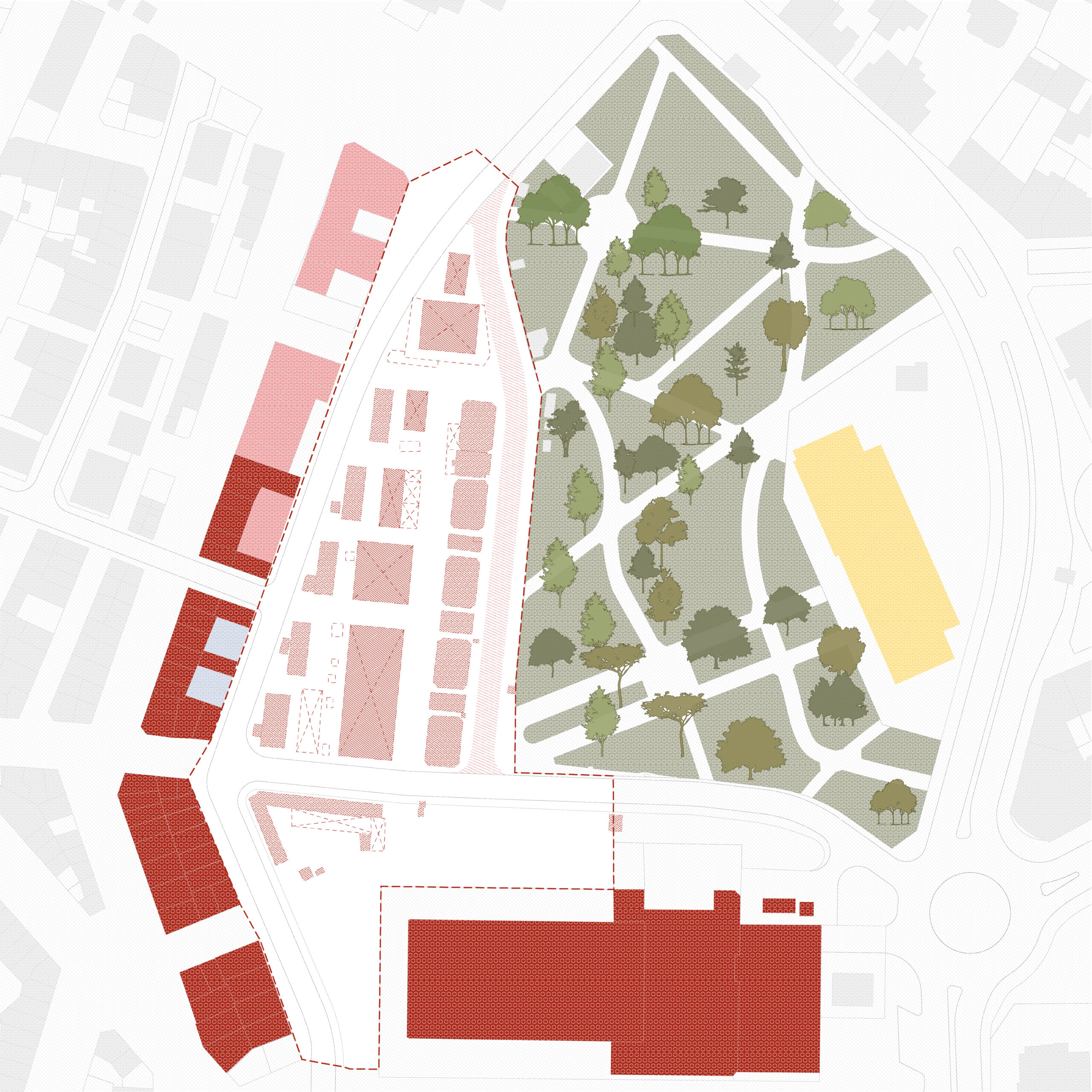Extension of the park and creation of pedestrian connections, making the site usable as public space.